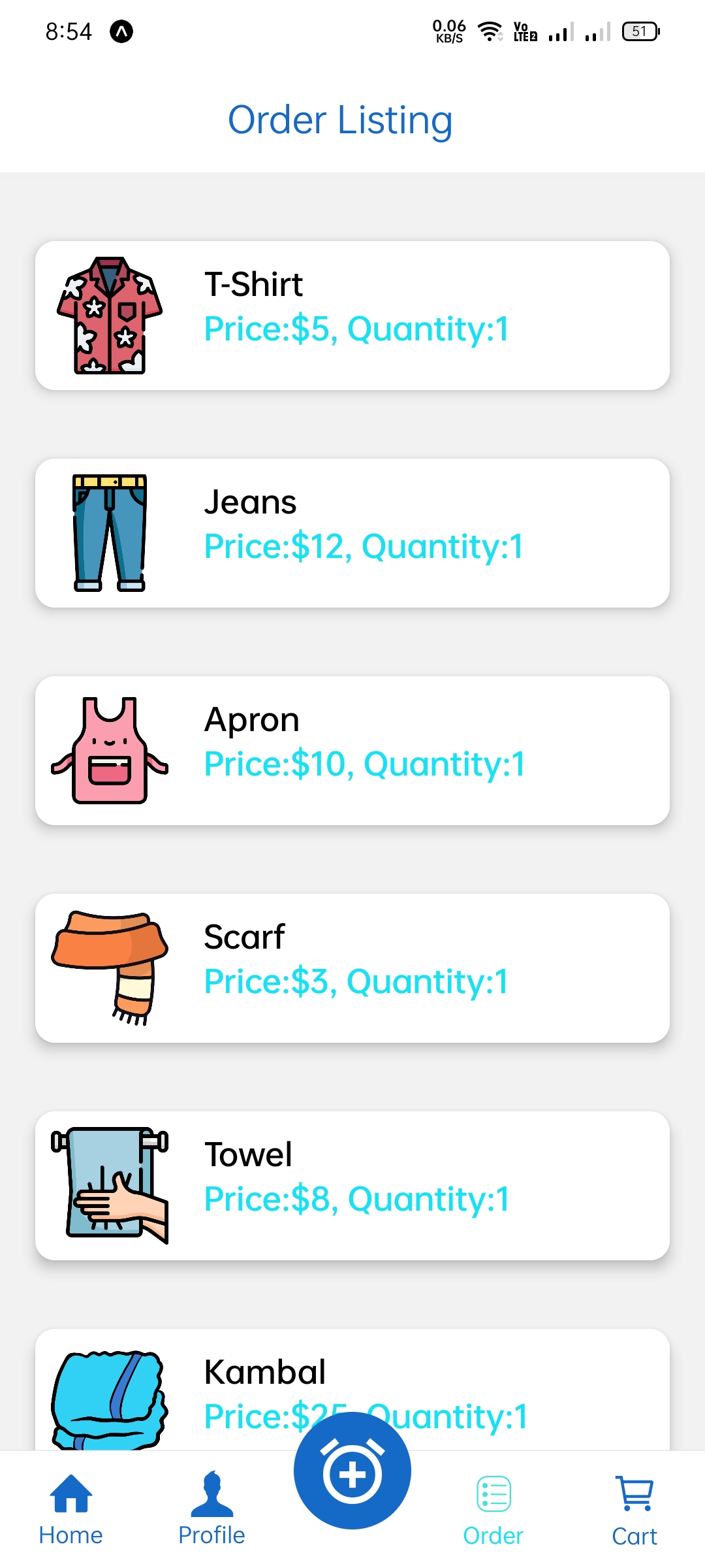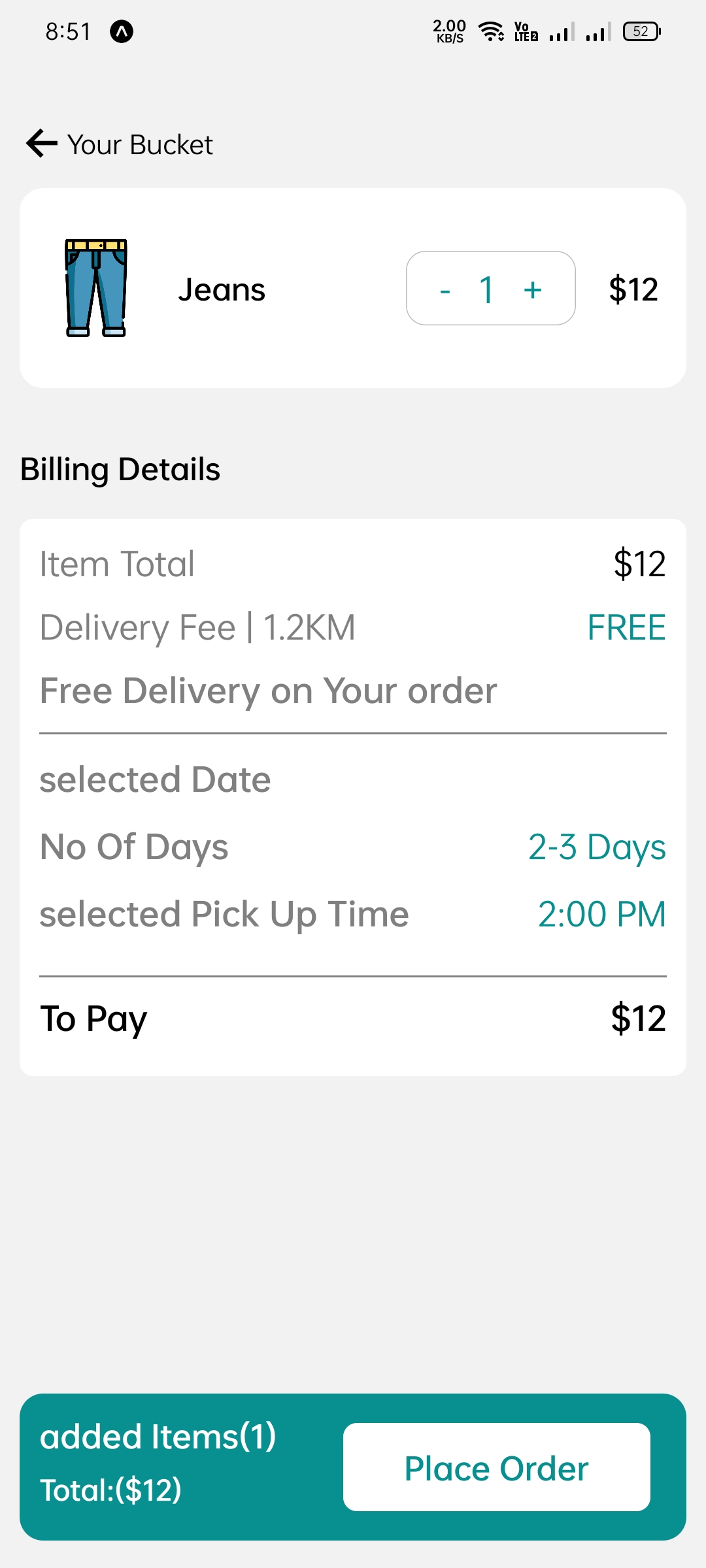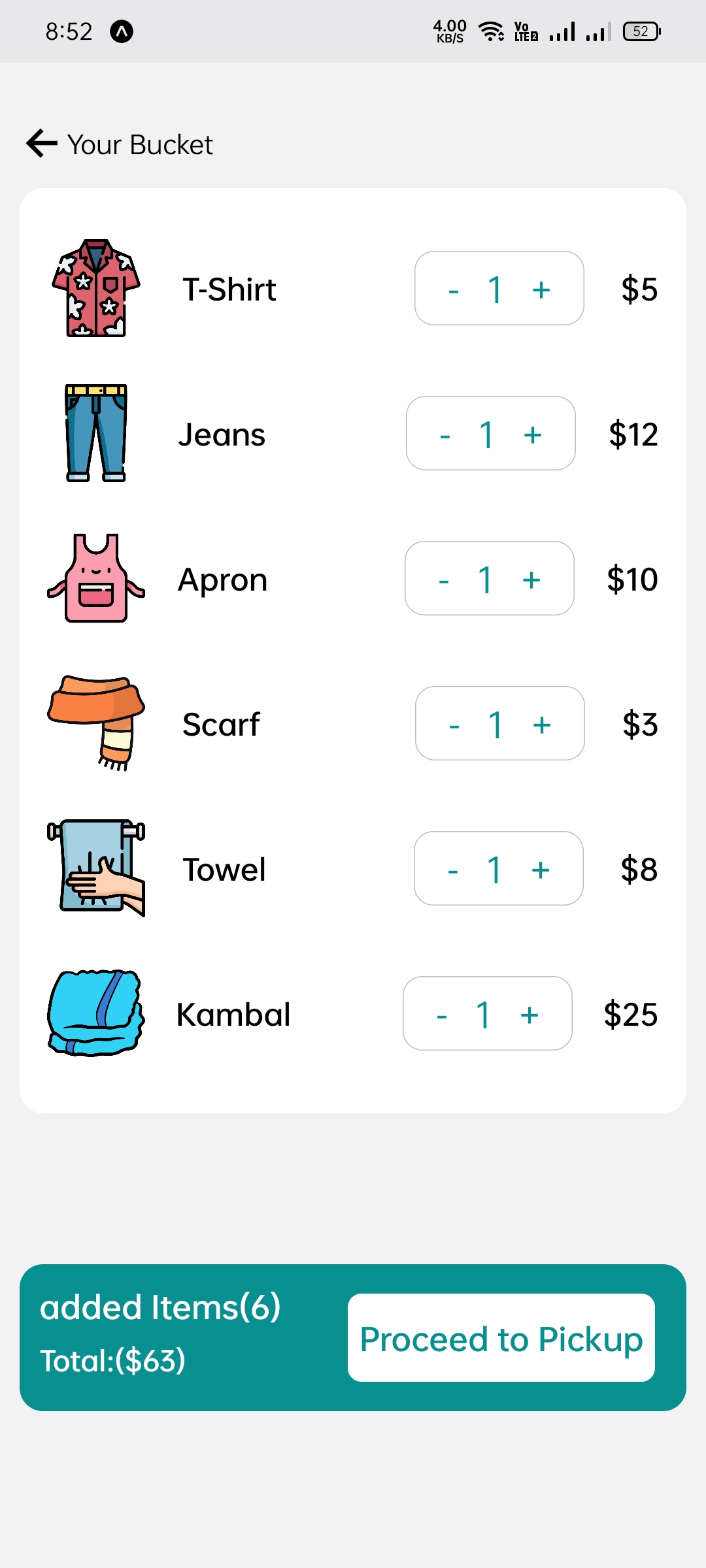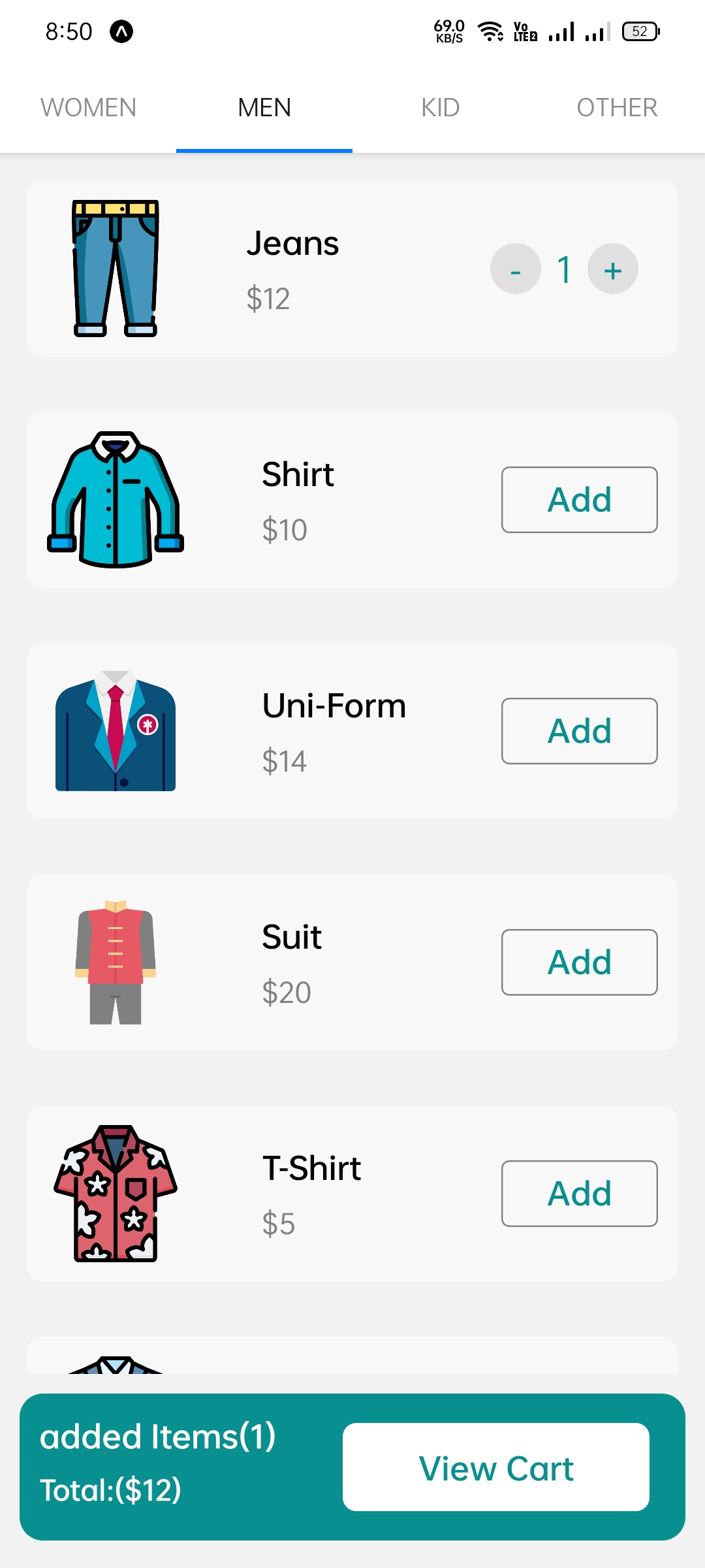 • Intuitive Ordering Process: The app features a straightforward flow that allows users to select items based on clothing categories (MEN, WOMEN, KID, OTHER) and specific types (Jeans, Shirt, Uni-Form, Suit, T-Shirt, etc.) with clear pricing and quantity adjustments.