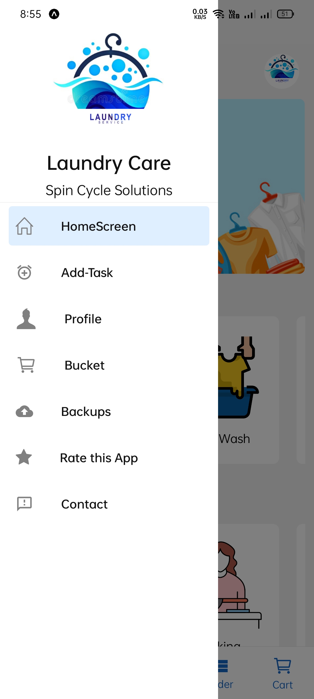 • Comprehensive Navigation: A robust side menu ensures quick access to all essential features, including the HomeScreen, Add-Task, Profile, Bucket (Cart), Backups, Rate this App, and Contact information.