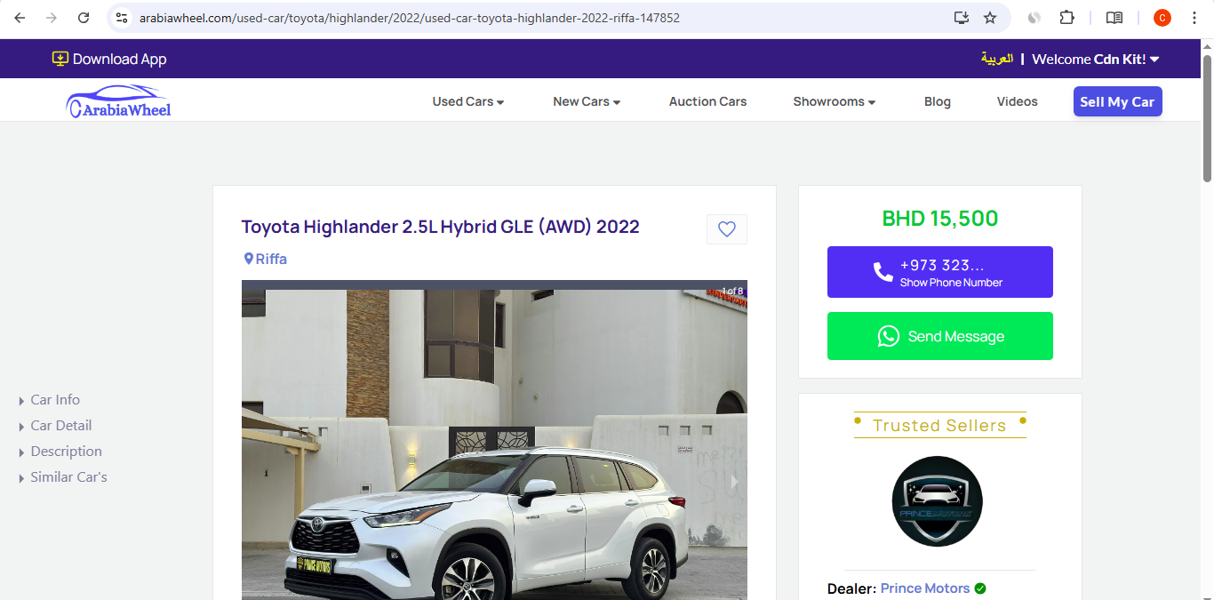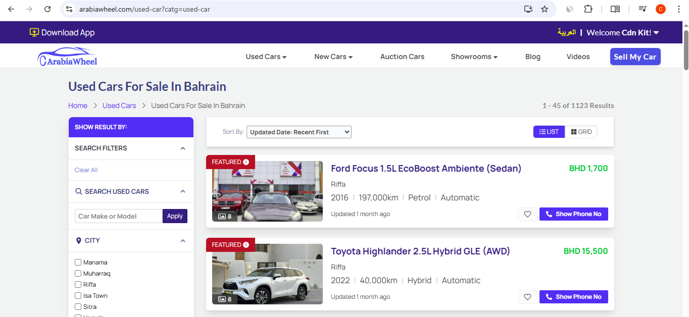 • Used Car and New Car Listings: Features robust search and filtering tools (by city, make, model, price range) to help buyers find their "next match." Listings display detailed car information, pricing (BHD), and contact options to Show Phone Number or Send Message to the seller.