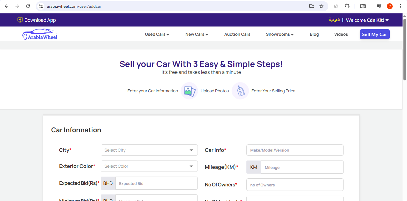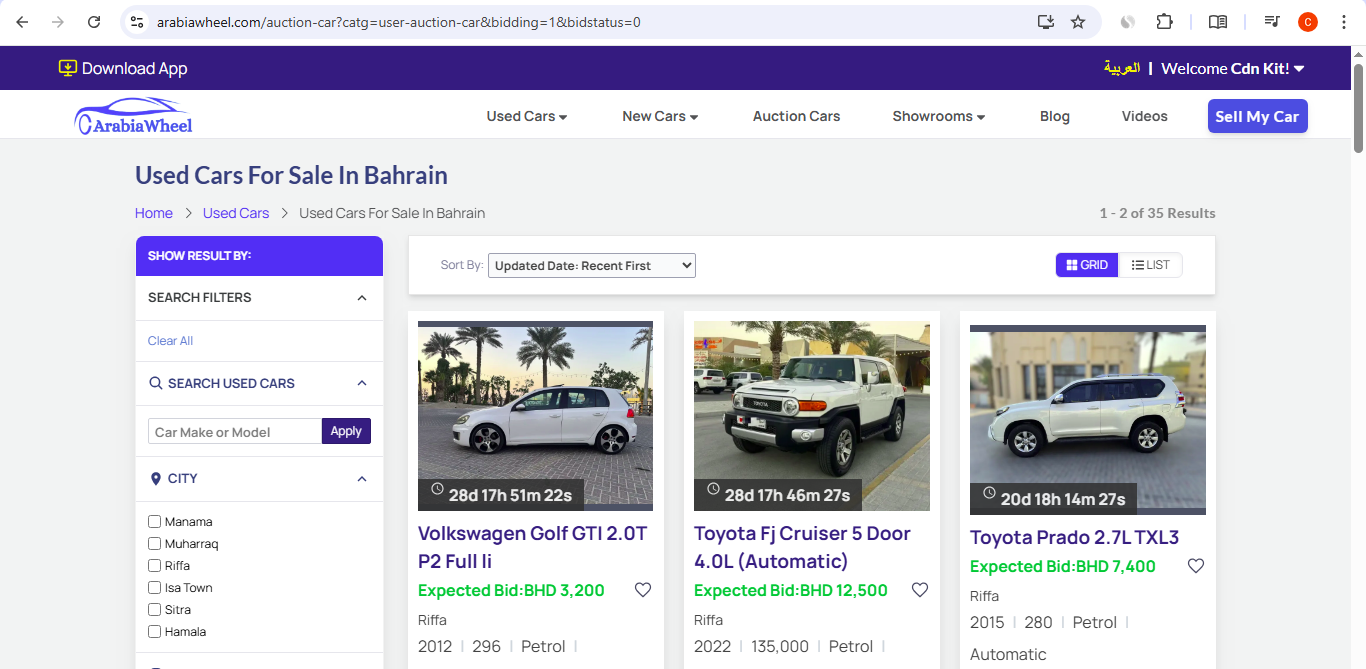 This project is a dynamic, full-featured web application, ArabiaWheel, which functions as an end-to-end automotive marketplace. It caters to buyers and sellers interested in Used Cars, New Cars, and Car Auctions, primarily serving the market in Bahrain. The platform is designed to provide users with a comprehensive, transparent, and seamless experience for all their car-related needs.