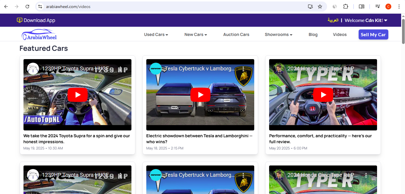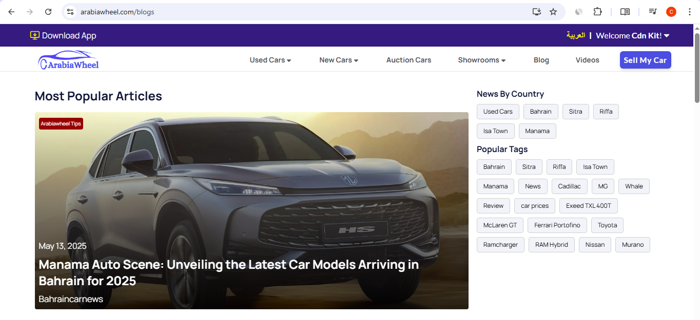 • Engaging Content: Includes a Blog for popular articles and industry news (e.g., 'Manama Auto Scene'), and a Videos section featuring reviews and featured car content to keep users engaged and informed.