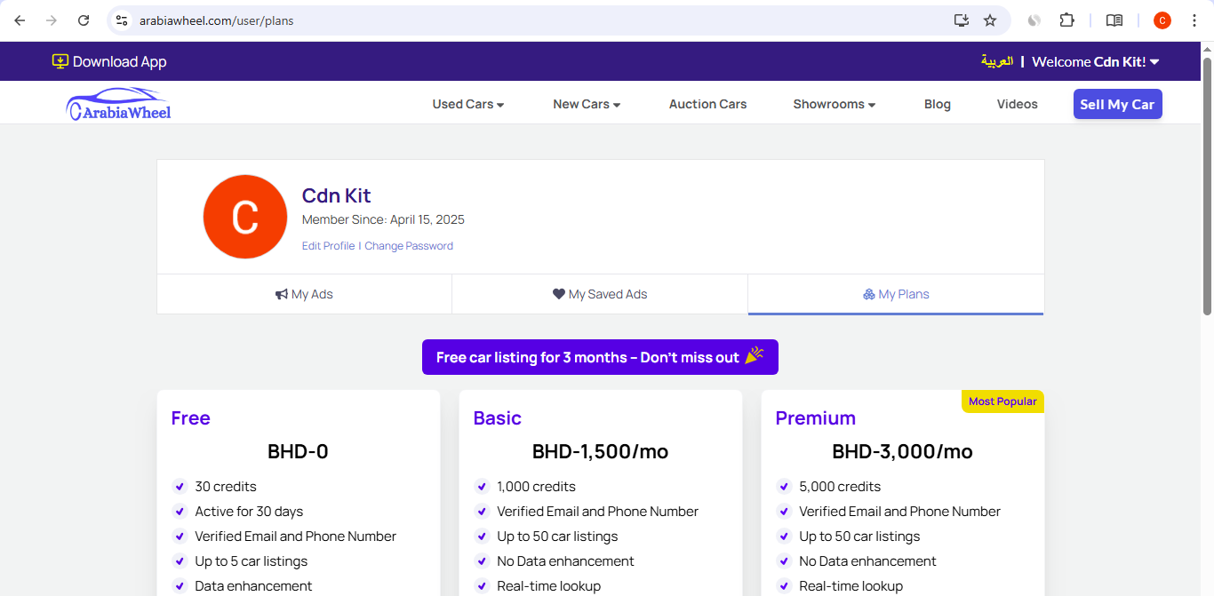 • User Profile: Features a personalized profile area for managing My Ads, My Saved Ads, and My Plans.