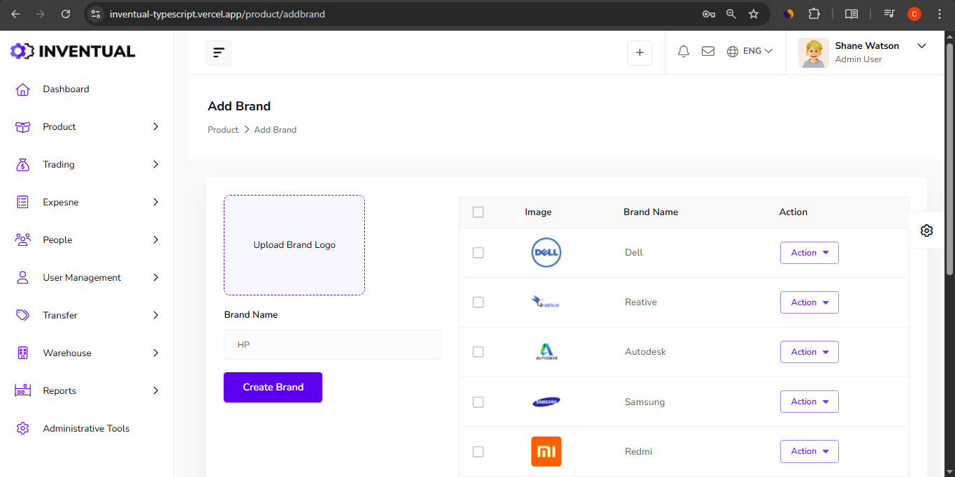 - Product Management: The Product module facilitates the organization of inventory, including the ability to Add Brand with logo upload, brand name creation, and a list of existing brands (e.g., Dell, HP, Samsung).