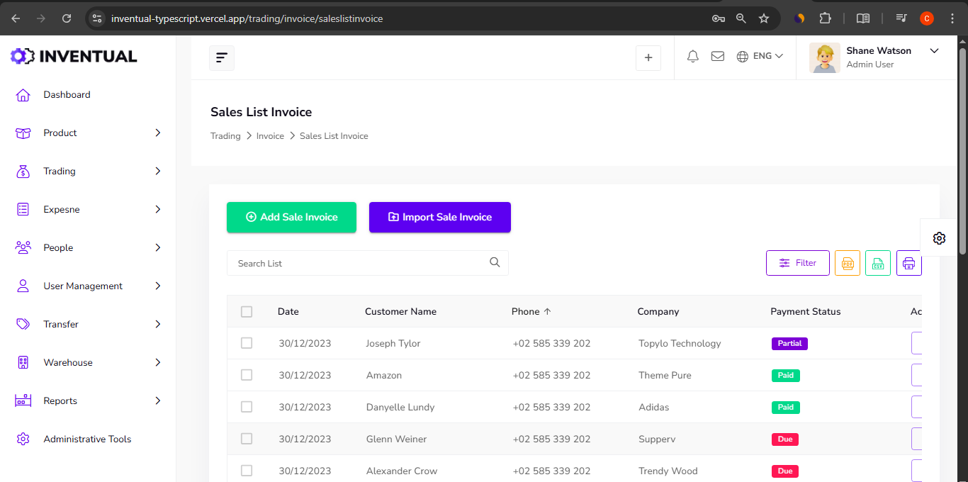 - Sales and Invoicing: The Sales List Invoice module allows for seamless tracking of sales transactions, displaying details like Date, Customer Name, Phone, Company, and Payment Status (e.g., Partial, Paid, Due). It supports adding new invoices and importing sales invoices.